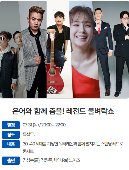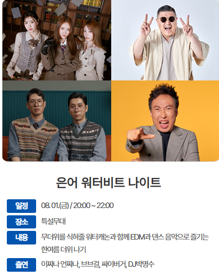 - 개막식 & 초청 가수 공연: 축제 첫날인 7월 26일 저녁에는 성대한 개막식이 열리며, 국내 최정상급 인기 가수들이 총출동하여 축제의 시작을 화려하게 알립니다. TV에서만 보던 가수들의 라이브 무대를 시원한 강변에서 직접 경험할 수 있는 특별한 기회가 될 것입니다. 짜릿한 가창력과 신나는 멜로디로 모두가 함께 즐길 수 있는 무대가 기대됩니다!