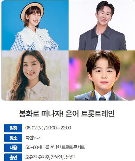 - ✨ 한여름 밤의 문화 공연: 축제의 클라이맥스! 🎇축제의 낮이 활기찬 물놀이와 맨손 잡이로 뜨겁다면, 밤은 봉화 내성천변을 수놓는 환상적인 문화 공연으로 물듭니다. 단순히 음악 공연이 아닌, 빛과 소리, 그리고 자연이 어우러지는 종합 예술의 장이 펼쳐질 거예요.